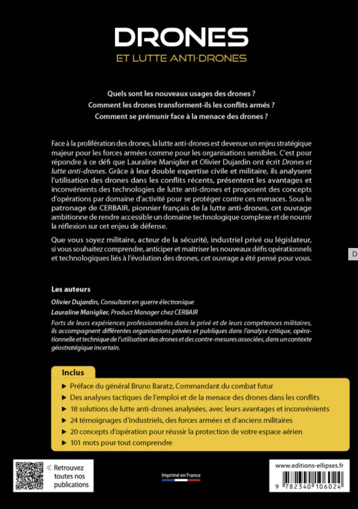 Face à la prolifération des drones, la lutte anti-drone est devenue un enjeu stratégique majeur pour toutes les organisations sensibles et militaires. C’est pour répondre à ce défi que Lauraline Maniglier et Olivier Dujardin ont écrit Drones et lutte anti-drones. Grâce à leur double expertise civile et militaire, ils analysent l’utilisation des drones dans les conflits récents, présentent les avantages et inconvénients des technologies de lutte anti-drones et présentent des concepts d’opérations par domaine d’activité pour se protéger contre ces menaces. Sous le patronage de CERBAIR, pionnier français de la lutte anti-drones, cet ouvrage ambitionne de rendre accessible un domaine technologique complexe et de nourrir la réflexion sur un enjeu de défense devenu majeur.